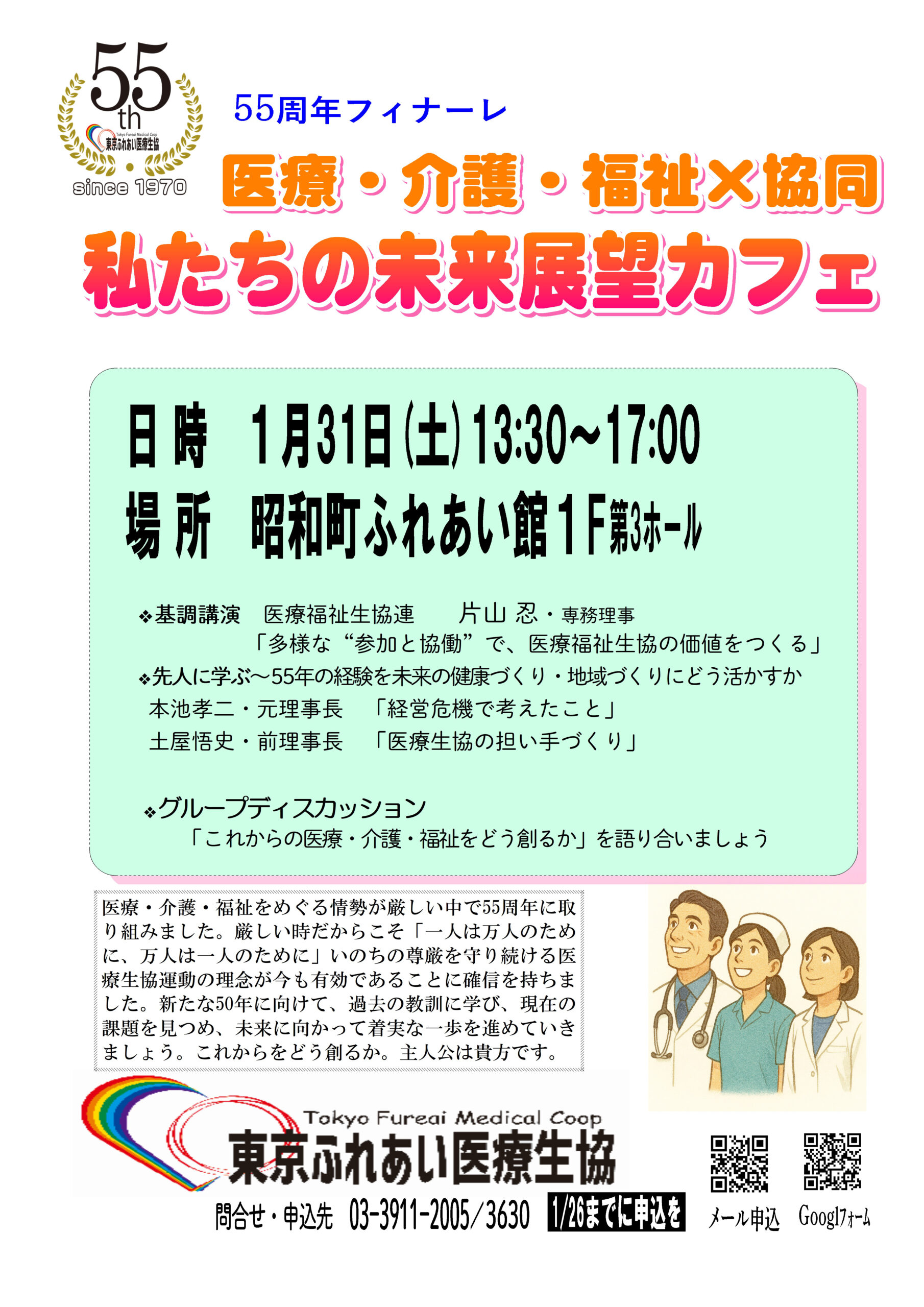 2026/01/09 1月31日(土)に、昭和町ふれあい館にて東京ふれあい医療生協55周年のフィナーレを飾るイベントを開催いたします。当日は医療福祉生協連の片山忍専務理事の基調講演、本池孝二医師、土屋悟史医師による講演、「これからの医療・介護・福祉をどうつくるか」についてのグループディスカッションを行う予定です。詳細はチラシをご覧いただき、1/26(月)までにお申し込みをお願いいたします。当生協の組合員に関わらず、多くの方の参加をお待ちしております。Googleフォームでのお申し込みはコチラ